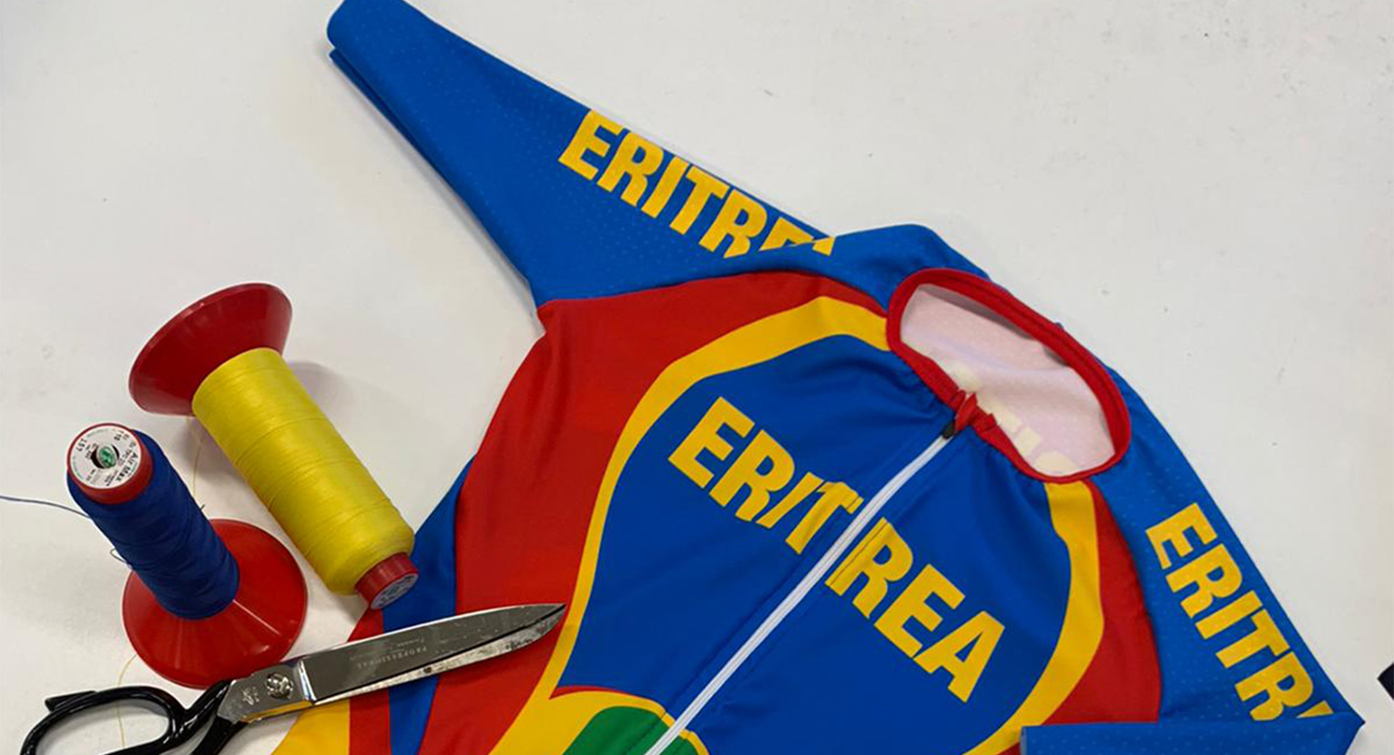 Ad agosto siamo stati nuovamente contattati da Alex che ci segnalava che il fornitore con il quale erano stati presi in precedenza gli accordi per realizzare la divisa dell’Eritrea aveva dei problemi e non poteva quindi tenere fede agli impegni presi. A noi faceva piacere poter aiutare Biniam e i suoi compagni, quindi ci siamo resi nuovamente disponibili. Sorgeva però un problema. Eravamo in agosto, la nostra azienda era chiusa e riapriva il 6 settembre, proprio il giorno in cui ci veniva chiesto di consegnare le divise.