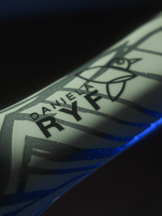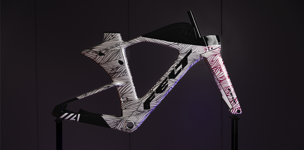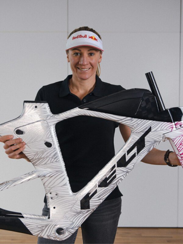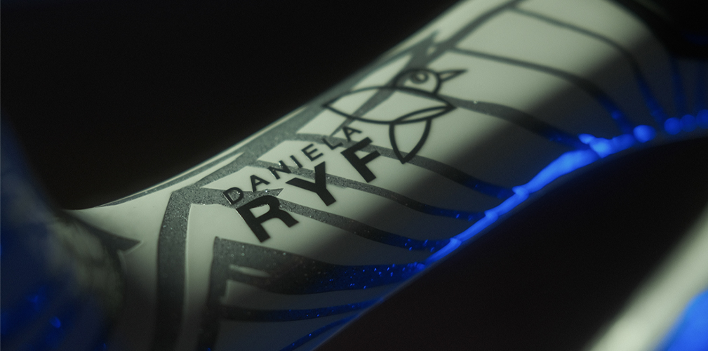 Ispirato al soprannome di Daniela Ryf (“Angry Bird”, ndr), il nuovo telaio IA 2.0 presenta una base bianca, argento e magenta, con un ricercato motivo astratto di piume. Il logo di Daniela Ryf adorna poi l’interno degli steli della forcella, mentre il suo nome trova spazio sul tubo superiore, protetto da uno strato di vernice trasparente.