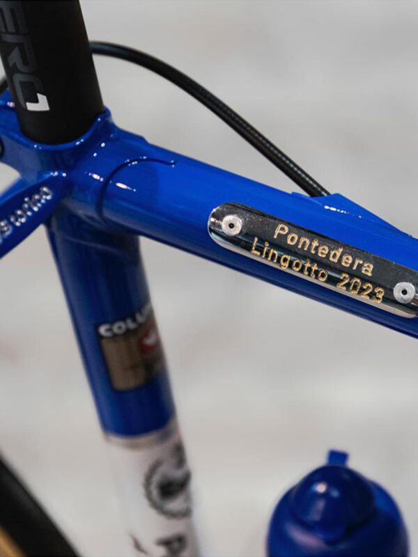 Si è trattato di un telaio in acciaio con congiunzione molto classiche. Forcella in carbonio, gruppo Chorus e ruote Zonda. L’abbiamo personalizzato con una targhetta speciale che celebrava la “Pontedera – Lingotto 2023”.