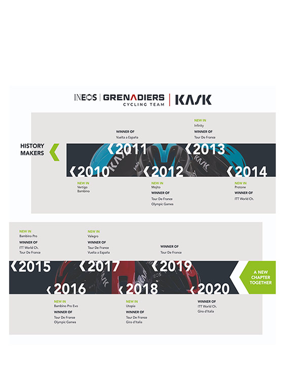 La storia vincitrice tra Kask e la squadra britannica è iniziata con l’iconico Mojito; il casco che ha accompagnato Sir Bradley Wiggins alla prima vittoria del team al Tour de France nel 2012. L’amatissimo Protone è arrivato nel 2014 ed è stato indossato durante la quarta conquista di un grande giro a tappe appena un anno dopo. Nel 2016, Kask ha rinnovato il contratto con la squadra britannica, lanciando successivamente il leggero Valegro e il rivoluzionario casco aerodinamico Utopia. Entrambi i caschi hanno tagliato per primi il traguardo diverse volte, hanno occupato il gradino più alto di tutti e tre i podi dei grandi giri.