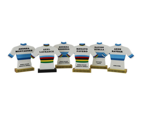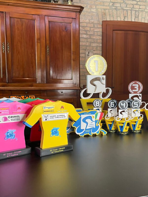 «Per il Meeting dei Giovanissimi – conclude – abbiamo realizzato un vero e proprio tappo di color sughero poi declinato in moltissimi formati, dai trofei alle medaglie, ai portachiavi che sono andati a ruba! Il Meeting si è svolto tra Valdobbiadene e Conegliano, nella patria del Prosecco… capirete bene… Per quanto riguarda invece il Giro Internazionale del Friuli Venezia Giulia, la nostra Regione, abbiamo prodotto dei trofei molto evocativi con la stilizzazione del profilo regionale in grado di ruotare a 360° sulla propria base simboleggiando appunto il concetto di giro. Molto bello anche il trofeo “cronometro” per i campionati italiani cronometro a squadre. Insomma, uno più bello dell’altro».