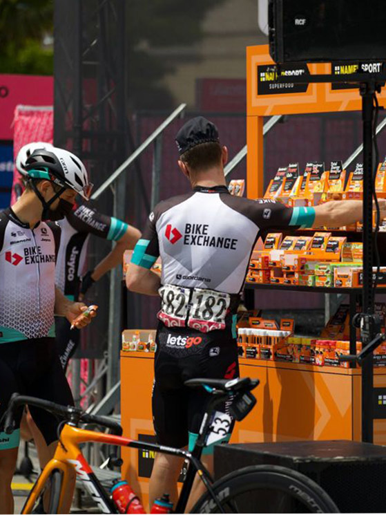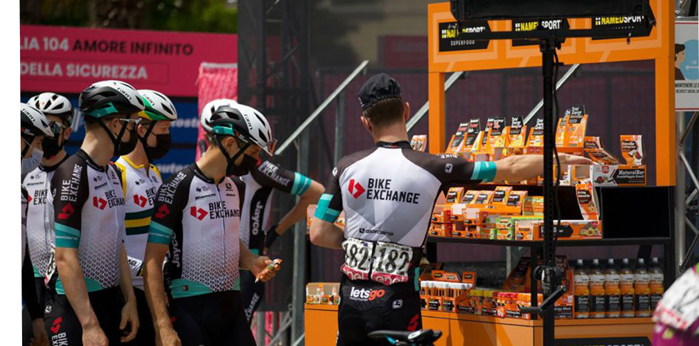 Namedsport è partner di tutti e tre i grandi Giri, qui la Bike Exchange si rifornisce prima di una tappa al Giro d’Italia