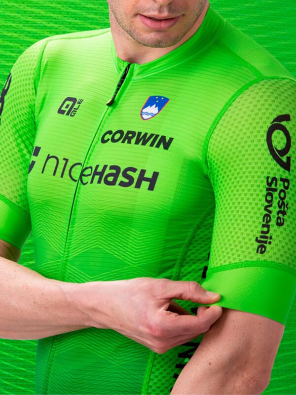 In virtù di questa partnership, Alé fornirà alla Federazione ciclistica slovena tutto l’abbigliamento da gara necessario: sia estivo che invernale, inclusi gli accessori. Da un punto di vista strettamente grafico, il celebre colore verde – il cosiddetto “Slovenian Green” – predomina largamente su questi nuovi capi. Viene elegantemente spezzato da giochi di geometrie tono su tono, sulle maniche e sul petto della maglia, mentre i pantaloncini sono di colore blu scuro con richiami di verde sulle cosce.