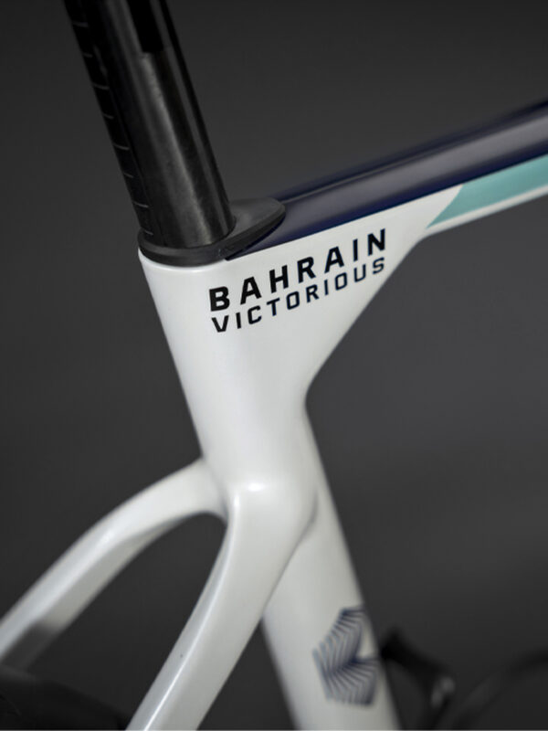 La scintillante verniciatura bianco perla delle nuove biciclette è ornata da dettagli dorati che fanno riferimento al Regno del Bahrain, mentre gli elementi verde acqua rappresentano le acque poco profonde dei due mari che circondano le coste del Paese arabo. Il mare del Golfo Persico e quello del Golfo del Bahrain sono famosi per i ricchi banchi di perle. Il passaggio dal nero (presente nella precedente versione) all’attuale blu navy, lungo il tubo orizzontale e l’interno delle forcelle, non rappresenta un semplice cambio di colore. Si riferisce infatti all’impegno da parte del Team Bahrain Victorious e dei suoi partner a ridurre l’impronta di carbonio nell’atmosfera, in linea con le linee guida dell’UCI che impone alle squadre azioni per ridurre le emissioni entro il 2030.