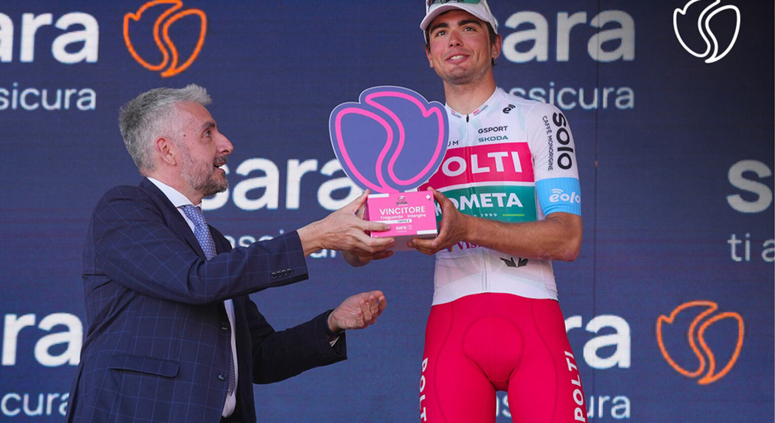 «Il Giro è sport e competizione – prosegue Tosti – ma è anche rispetto per il nostro bellissimo territorio e per il prossimo. Per questo, da ben sei anni supportiamo e sosteniamo l’evento, correndo letteralmente al fianco dei grandi campioni del ciclismo. Quest’anno, poi, siamo anche sponsor del Traguardo Intergiro (nella foto di apertura la premiazione 100% personalizzata Sara di una tappa): in ogni singola tappa, un traguardo volante… con un premio speciale targato Sara».