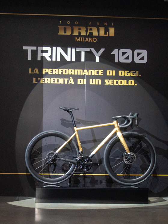 Nel corso della serata è stata svelata al pubblico un’altra bellissima novità. Parliamo della Trinity 100, un modello speciale in soli 10 esemplari della famosa Trinity. Un telaio in acciaio saldo brasato firmato Drali, caratterizzato per l’occasione da una finitura arricchita con foglia oro applicata a mano. Sul tubo sterzo il logo creato per celebrare i 100 anni del brand milanese. Un vero pezzo da collezione, mix perfetto di storia e lusso.