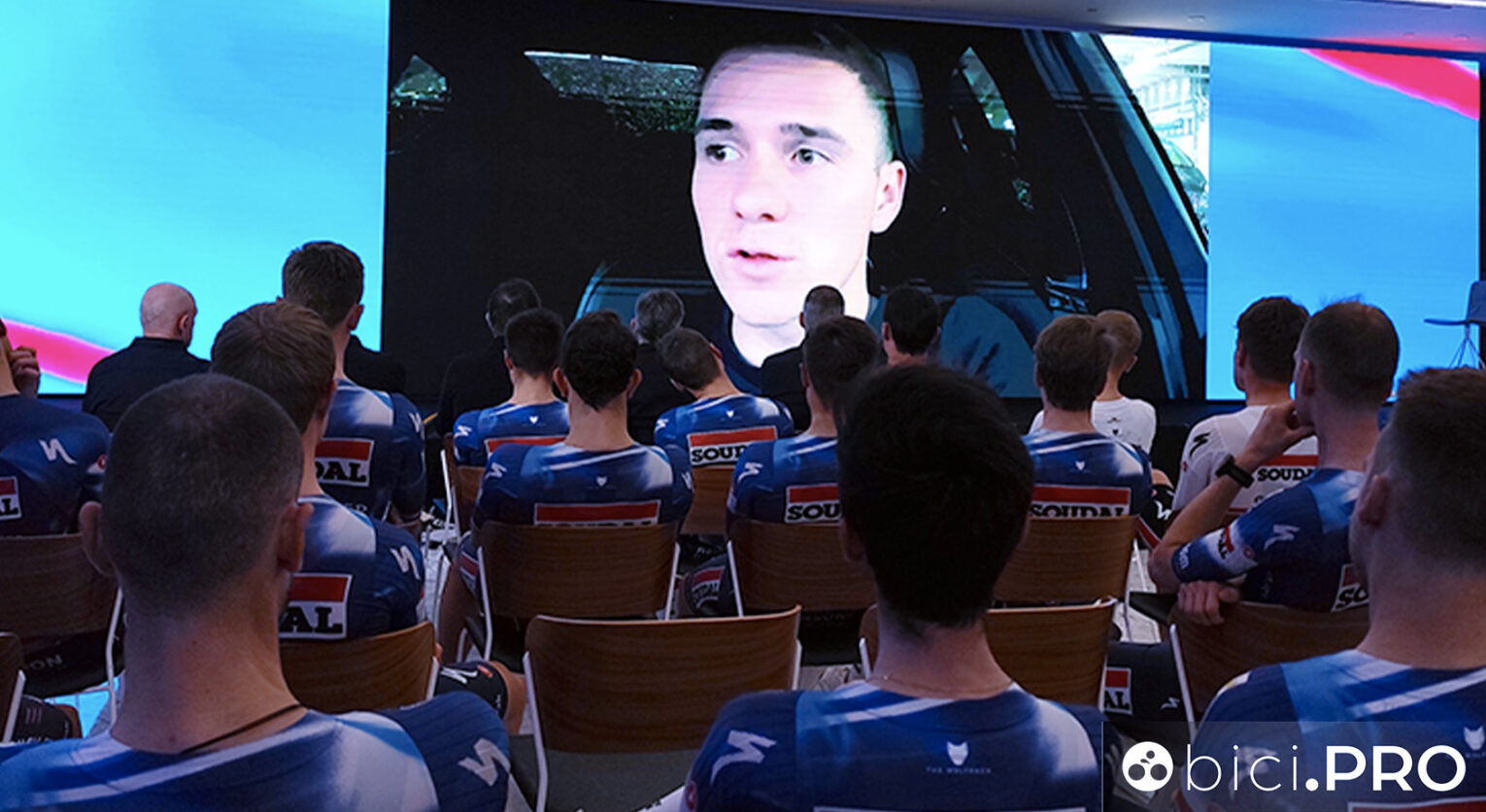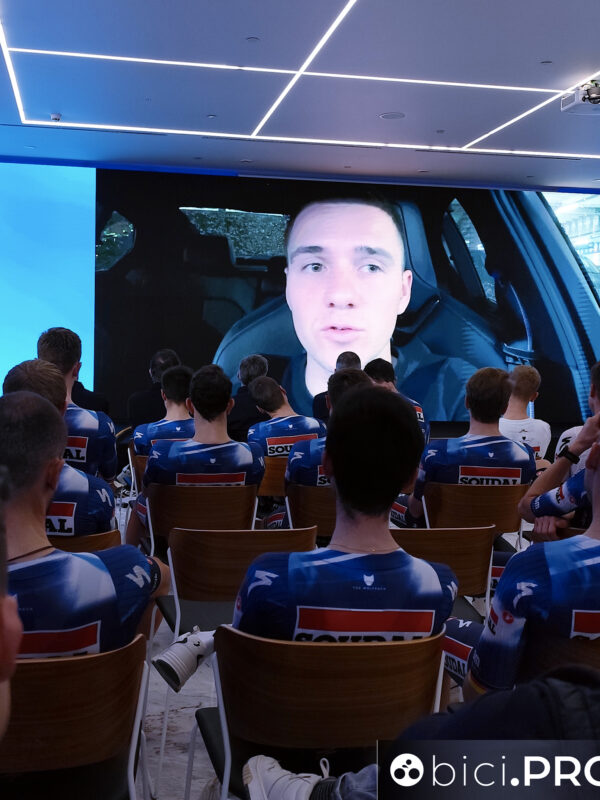Inizia Patrick Lefevere, pronto a lasciare dopo oltre 25 anni alla guida di questo gruppo. Sfilano tecnici, nuovi arrivati, chi deve partire per l’Australia e chi dovrà fare il leader nelle classiche e nei Grandi Giri. Si snocciolano numeri impressionanti, come il quasi milione di chilometri percorsi in gara dai corridori della squadra o le 700 catene consumate dal Wolfpack. E poi c’è lui appunto, Remco: grande atteso, grande assente, ma anche grande professionista, che per oltre mezz’ora si è intrattenuto con i giornalisti di mezzo mondo.
