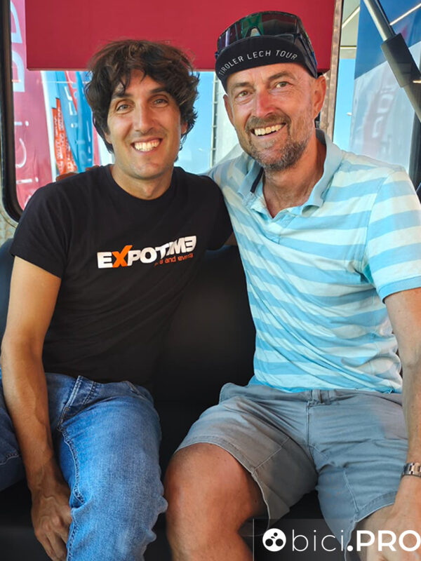 Per cui quando lo accogliamo nel nostro truck e per tenere a bada i due bambini attingiamo alle scorte di cioccolata, l’occasione di porgli qualche domanda ci è parsa altrettanto ghiotta. Assieme a lui c’è Marco Rossignoli, amministratore di Expo Time che organizza fiere e agevola la presenza a Eurobike delle aziende italiane (i due sono insieme nella foto di apertura).