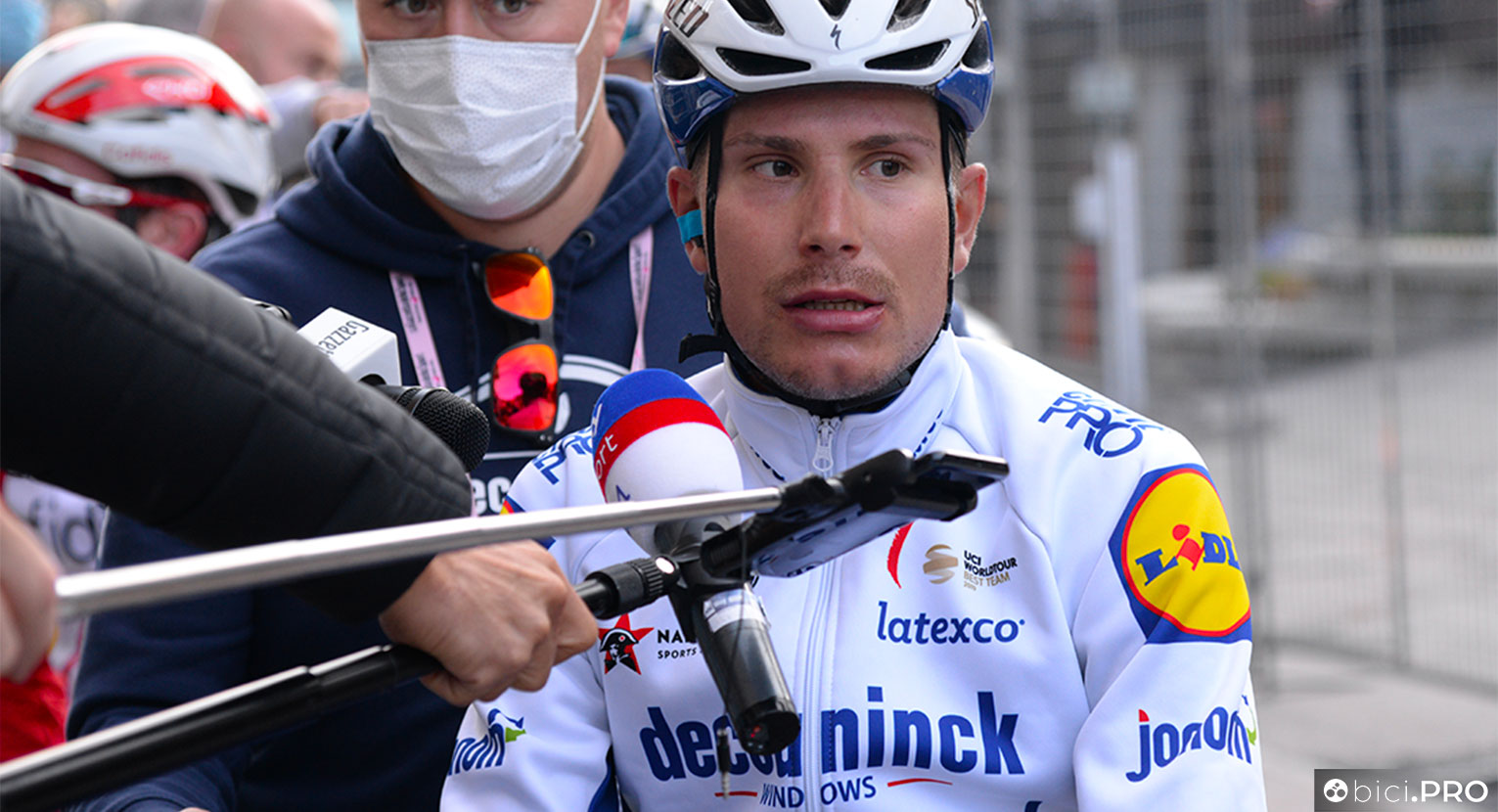 Esatto. Alla Tirreno-Adriatico l’avevamo collocata alla partenza: una porzione di spazio con doppie transenne in cui i giornalisti potessero fare domande agli atleti, rimanendo a distanza. Qualcuno però ha chiesto di parlarci dopo l’arrivo. I bus erano spesso lontani dal traguardo e andando, non sarebbe stato possibile seguire la conferenza stampa di vincitore e leader. Così mi sono accordato con gli uffici stampa che, prima di andar via, portassero i corridori nella zona del box stampa (nella foto di apertura Fausto Masnada con Phil Lowe, l’addetto stampa della Deceuninck-Quick Step).