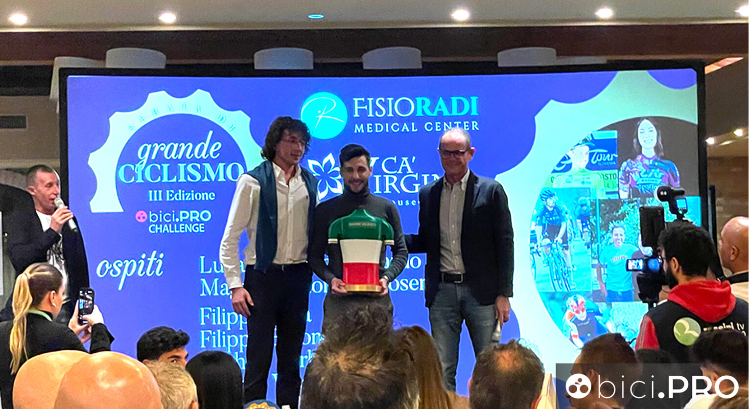 SAN GIOVANNI IN MARIGNANO – Una “Serata di Grande Ciclismo” sulle colline riminesi al confine tra Romagna e Marche. L’occasione creata da Fisioradi e Ca’ Virginia per incontrare i campioni italiani e non solo, per premiarli in nome della bici.PRO Challenge. Arrivata alla sua terza edizione, quest’anno a ricevere la maglia tricolore stampata in 3D da Morfeo Gadget non poteva che essere Simone Velasco.