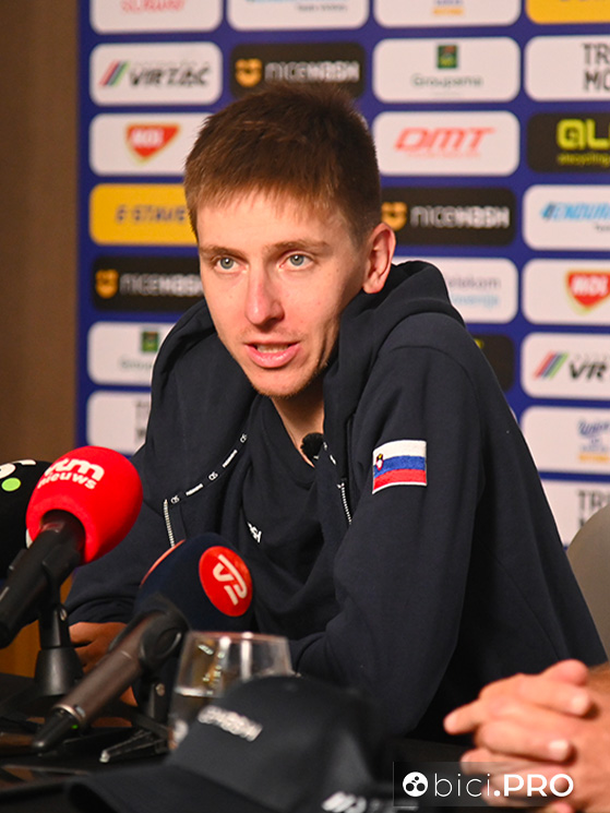 Pogacar non si è rasato e ha un timido accenno di baffi. Da tempo ha perso lo stupore di quando, ragazzino, si affacciava nel mondo dei grandi. Adesso parla da campione del mondo. Scherza dicendo che l’ultimo allenamento con la maglia iridata l’ha fatto martedì, ma non è certo che non possa accadere di nuovo la prossima. Le domande lo rincorrono, lui risponde a bassa voce. Uros Murn, il commissario tecnico della Slovenia, è seduto accanto e parla per monosillabi. Dice che sono qui tutti per Tadej, ma che Roglic farà un lavoro importante nel finale. Poi il microfono passa al campione.