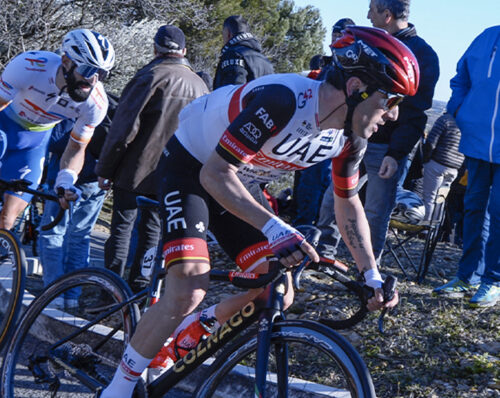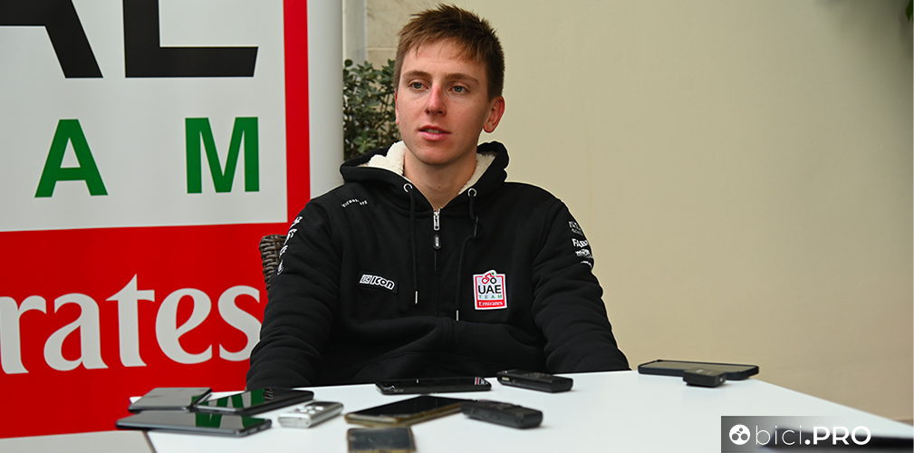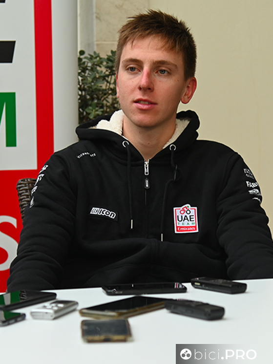 Pomeriggio fresco sulle colline alle spalle di Benidorm. L’hotel scelto dal UAE Team Emirates è sprofondato in un quartiere residenziale, di villette e divieti di sosta. Intorno, un andirivieni effervescente di facce nuove e vecchie conoscenze. Bisogna stare attenti a non fotografare i nuovi già vestiti col materiale nuovo, ma intanto si riallacciano i fili dopo lo stacco invernale. Una ventina di giornalisti, noi i soli dall’Italia. Pogacar è rilassato, solo il ricordo del Tour provoca qualche prurito. Con un gesto tira via il cappuccio della felpa nera dagli occhi, lo sguardo è fermo.