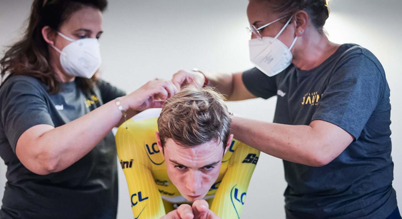 Di solito nella stanza in cui facciamo le misure, troviamo già la bici montata. Ci spostiamo di albergo in albergo. Da Pogacar siamo arrivati che erano giù a fare colazione. Erano le 8. Abbiamo messo le macchine sui tavoli del ristorante, poco distante da dove mangiavano i corridori. Hanno portato i rulli e le bici. Pogacar è andato in bagno, si è messo il body, è venuto lì, abbiamo preso le misure che servivano, poi lui è tornato a colazione. E mentre finiva di mangiare, noi abbiamo fatto le sistemazioni. Credo che la scena la possiate vedere anche nella serie Netflix sul Tour.