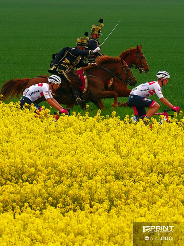 Era la prima tappa in linea del Giro d’Italia a Budapest. C’è un aneddoto interessante e divertente. Dalla parte opposta rispetto a dove correvano i cavalli, c’erano dei piloni della corrente e non mi piacevano per niente nell’inquadratura, perché cerco sempre una foto pulita. Iniziai a camminare da quel lato nel campo di colza e mi arrampicai su uno di questi piloni e appunto riuscii a fare questo scatto appeso solo con le gambe perché con le mani dovevo fotografare, stringendo i corridori e i cavalli in un piano unico. Poi quei pantaloni li buttai via, perché diventarono completamente gialli.