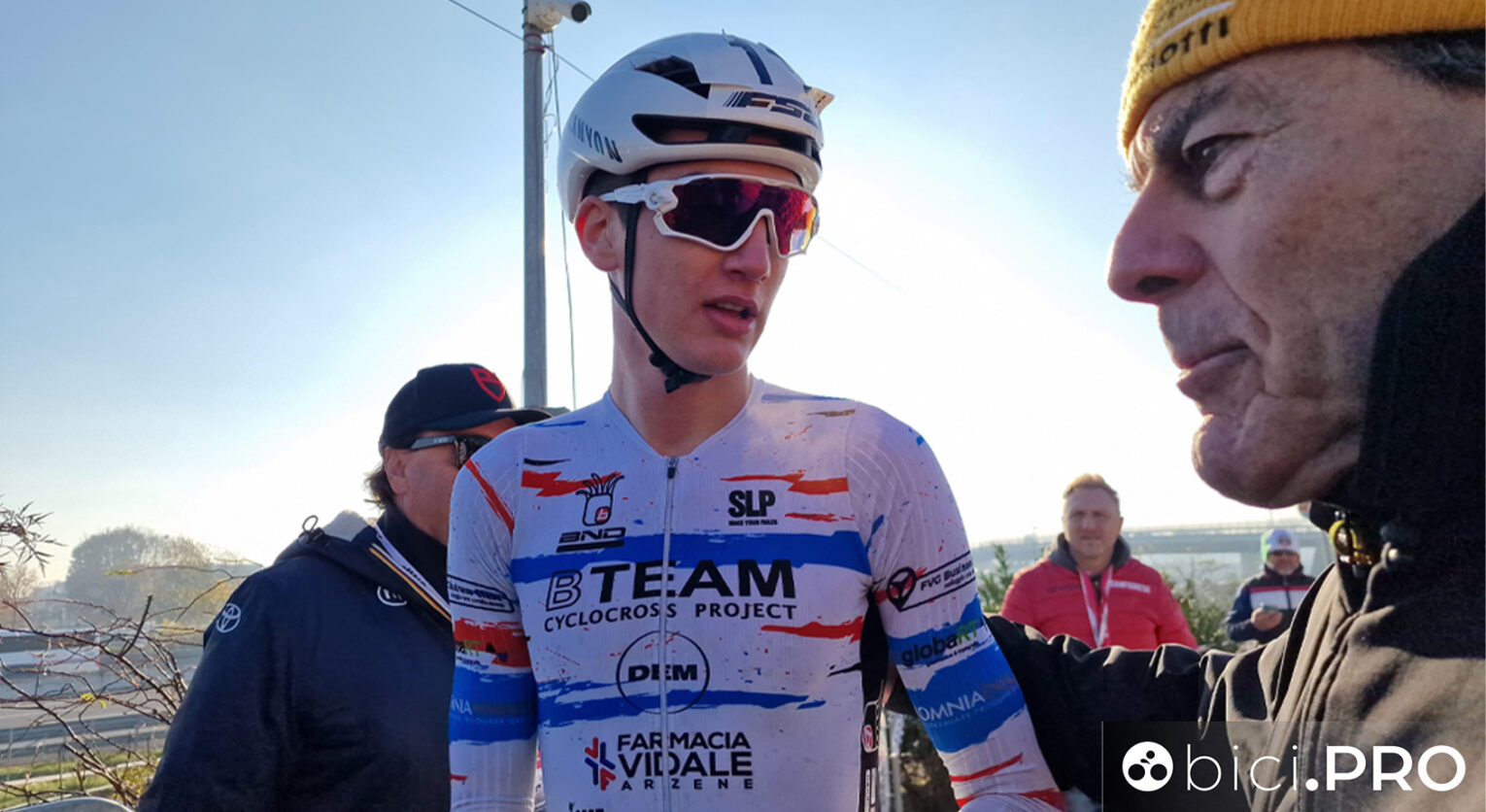 BREMBATE – Il sole cerca di salire alto nel cielo e scaldare le gambe e le guance dei corridori ma non ci riesce. E’ dicembre e al Trofeo Mamma e Papà Guerciotti, corso per la prima volta al Vittoria Park, il tempo è bello e freddo. Una vera giornata di ciclocross. I corridori, giunti in grande numero e chiamati a partecipare dal cittì Pontoni, cercano riparo sotto giacche a maniche lunghe e scaldacollo tirato su fino agli occhi. Si fa quasi fatica a riconoscerli, serve un secondo in più ma alla fine ci si riesce. Nell’arco dell’intera mattinata c’è tempo per girare tra camper e furgoni per parlare con tutti, tra curiosità e saluti ci imbattiamo in una figura alta e slanciata. Si tratta di Stefano Viezzi, campione del mondo juniores di ciclocross e da questo inverno passato under 23. Il talento del friulano ha attirato su di sé gli occhi della Alpecin Deceuninck, e dal 2025 sarà uno dei ragazzi del devo team.