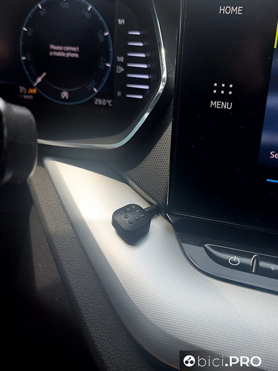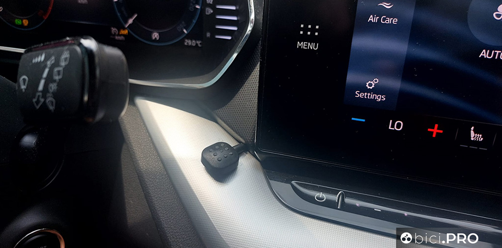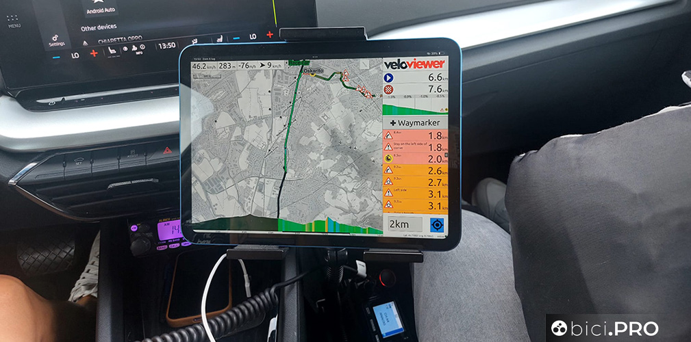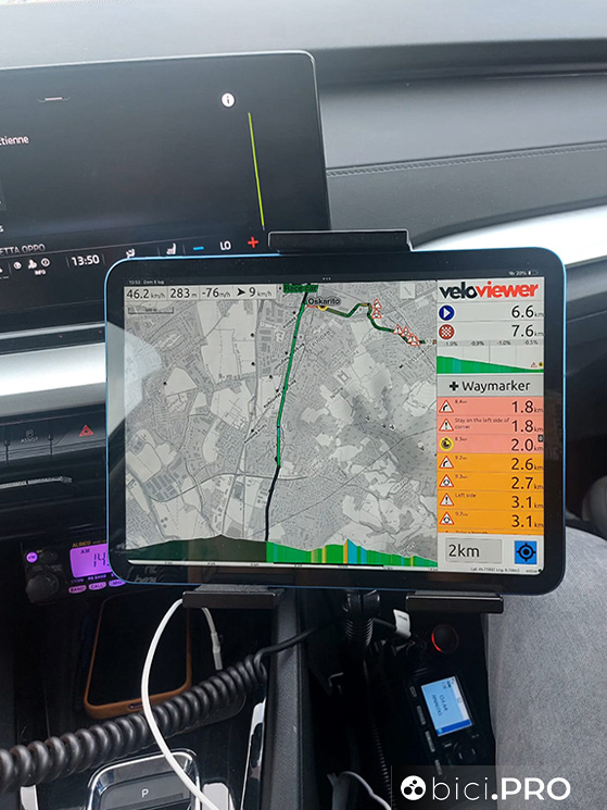 La plancia della Skoda della Human ha il classico grande schermo del navigatore di serie che all’occorrenza diventa una piccola tv attraverso un pulsante nero aggiunto all’apparecchiatura standard. Sulla parte destra del cruscotto invece è installato un porta–tablet in cui vedere la mappa del percorso su VeloViewer con la segnalazione di ogni riferimento. Dalla curve alle rotonde, agli spartitraffico, oltre ovviamente ai chilometri percorsi e da percorrere. Oppure ai dati di salite e discese.