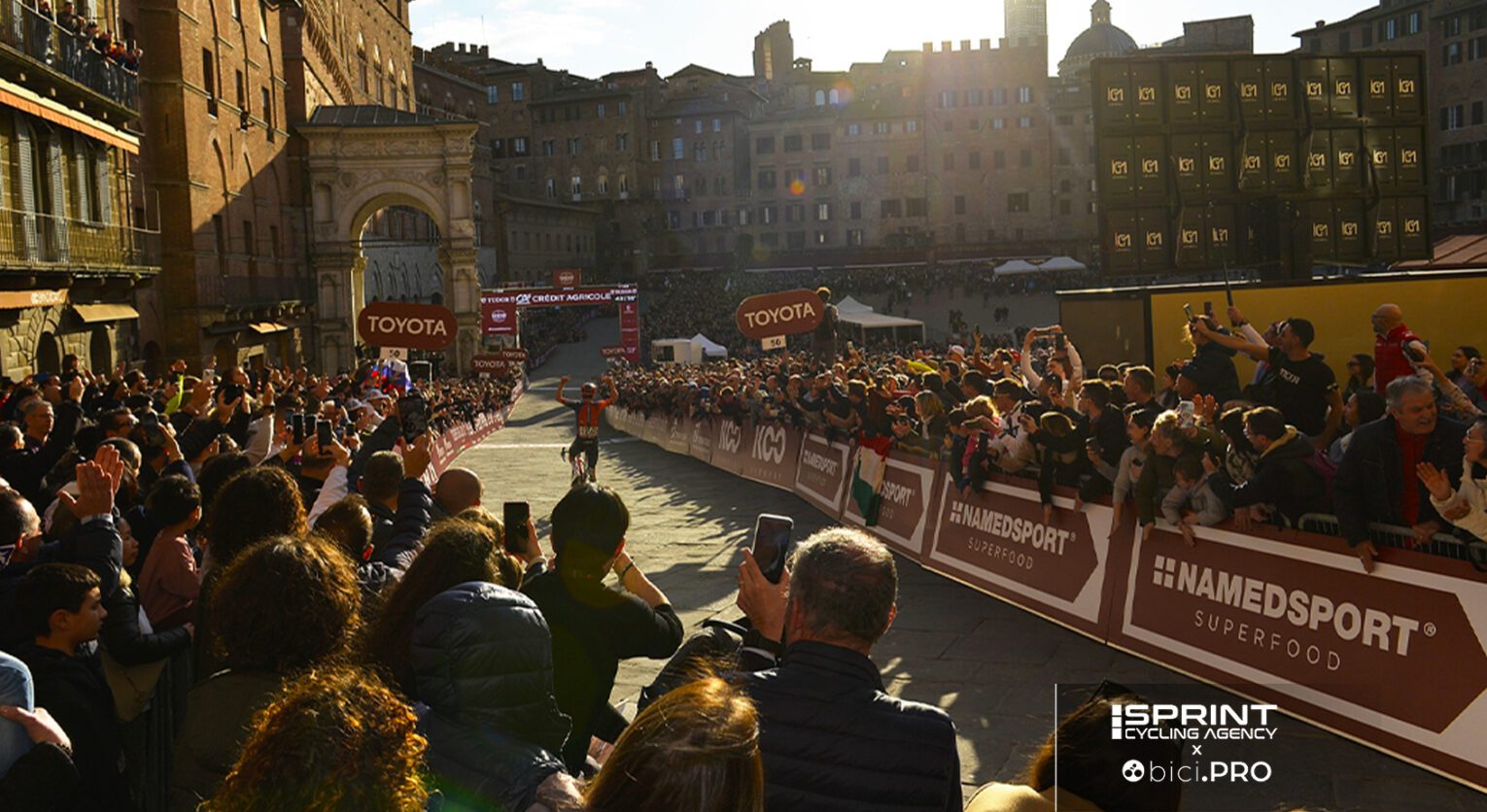 Tom Pidcock varca la soglia di Piazza del Campo: il boato. Il pubblico esplode in applausi e urla di incitamento: per tanti chilometri lo hanno seguito da solo nella sua impresa, ansiosi che qualcuno potesse raggiungerlo, ma allo stesso tempo desiderosi di vedere un piccolo gruppetto decidere la corsa davanti ai loro occhi, negli ultimi metri del percorso. Sui volti compaiono sorrisi spontanei, quelli che sanno di felicità. I volti dei corridori che arrivano sono stanchi, ma contenti: sembrano appena usciti da una vecchia foto, con i colori un po’ sbiaditi, ma è solo un po’ di polvere.