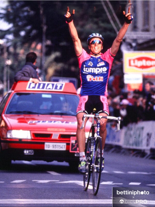 La gara finisce così. A un chilometro dallo scollinamento, quando il gruppo riprende Inaki Gaston sul Poggio, scatta forte Fondriest che aumenta in progressione e inizia la discesa con 10” di vantaggio. In vista del traguardo si gode il momento, gli applausi e il successo da dedicare a Maria Vittoria. Trionferà con 4” sul povero Gelfi e 9” su Sciandri che regola il gruppo in volata.