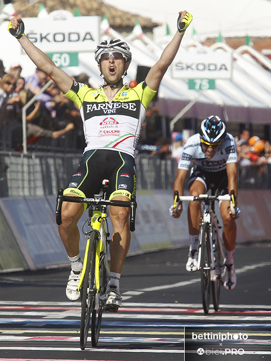 «E’ ancora è un’emozione quella tappa per me. Ricordo la scarica di adrenalina mentre taglio la linea d’arrivo. A metà corsa vado in ammiraglia e sparo anche due cavolate con Scinto. Gli dico: “Pitone (il soprannome del ds toscano, ndr), sull’ultima salita stacco tutti e arrivo solo”. Mi guarda ridendo e io stesso me ne vado sorridendo. Fatto sta che prendo lo strappo finale davanti. E non fu neanche così difficile quella “limata”. Sapete, la giornata perfetta. Mi alzo, scatto forte e vado. Solo ad un certo punto ho avuto paura. Fu l’unico momento duro della giornata. Vedo la sagoma di uno che mi insegue. Solo dopo ho saputo che era Contador».