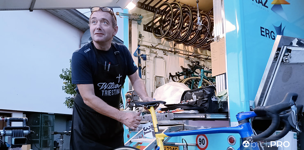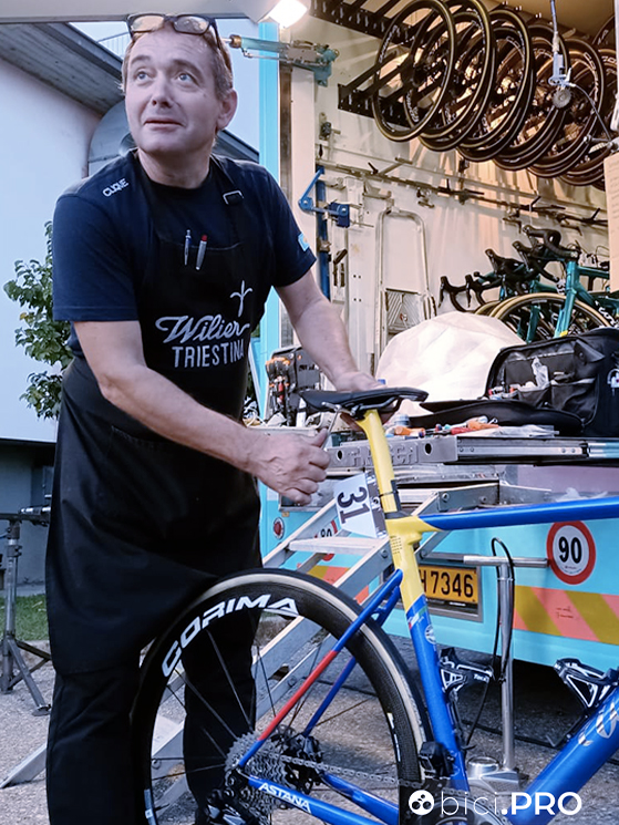 Mentre Martino racconta, Gabriele Tosello è lì che prepara la sua ultima bici. La Wilier con la verniciatura speciale che ricorda i successi di Nibali nei grandi Giri.