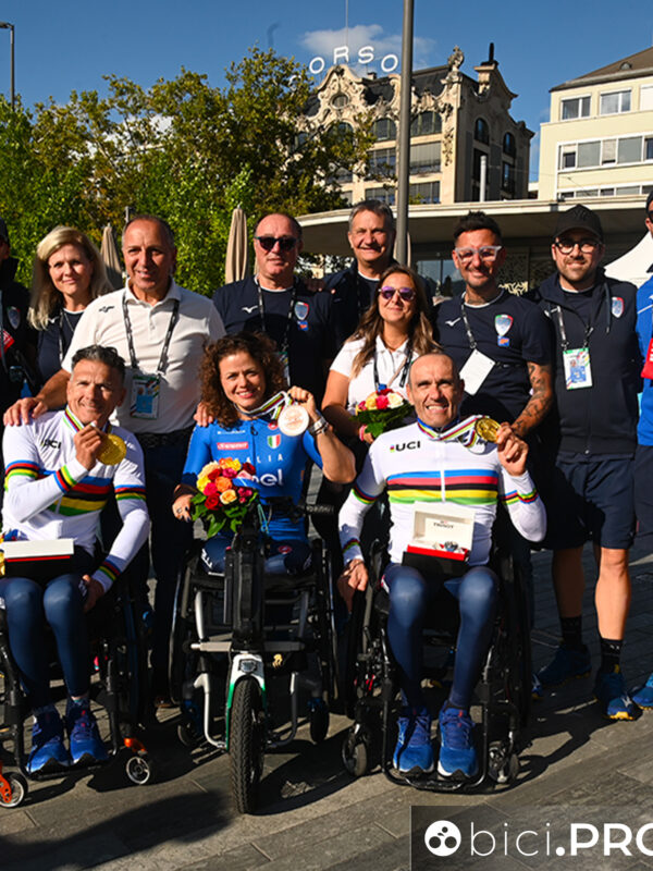 ZURIGO (Svizzera) – «Facciamo come Ganna – dice Mazzone – mettiamo in mezzo lei che però è più alta!». Così il pugliese in maglia iridata fa passare di là Cornegliani, vincitore oggi del secondo mondiale, e in mezzo mettono Ana Maria Vitelaru che ha conquistato il bronzo. Come Ganna, Affini e Remco nel mezzo, solo che questa volta le maglie iridate sono ai lati. Dopo la vittoria nella staffetta di apertura, un altro pomeriggio d’oro ed emozionante per gli azzurri di Pierpaolo Addesi.