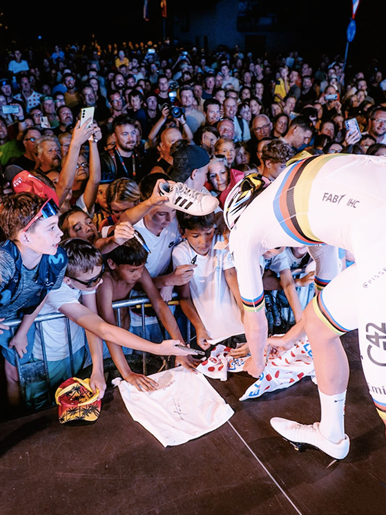 Tutti da Tadej Pogacar. O meglio pochi eletti e tanto pubblico… da Tadej Pogacar. A distanza di una settimana scarsa dal suo criterium, a Komenda non si è ancora spenta l’eco di una fantastica giornata di sport che ha visto l’abbraccio dei tifosi sloveni attorno al campione del mondo (in apertura (foto @alenmilavec).