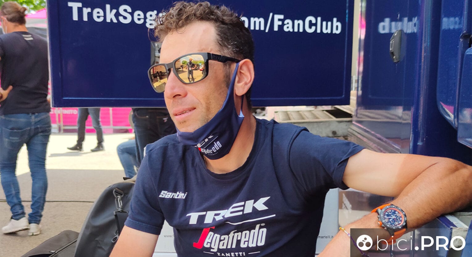 Caldo torrido alla partenza da Senago, il pullman della Trek-Segafredo delimita una piccola oasi di ombra. Chiedere a Nibali di parlare di sé e di un Giro al di sotto delle attese sarebbe indubbiamente interessante, ma forse prematuro. Però quando gli chiediamo di fare due parole sul suo ex gregario, lo Squalo non si fa pregare. Scende dal pullman e viene a sedersi su un frigorifero da campo. Oltre la transenna, sua moglie Rachele tiene al guinzaglio un cagnolino minuscolo, che appena può scappa da tutte le parti.