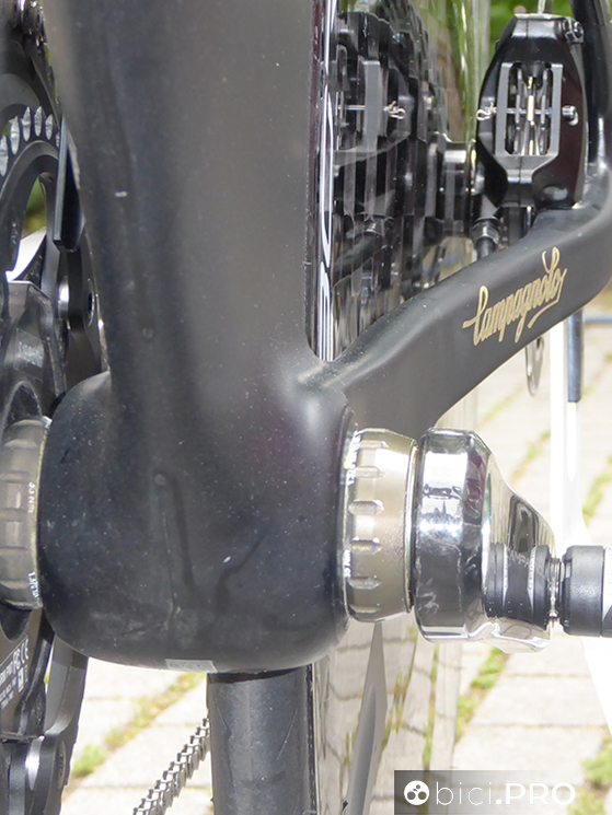 C’è la tubazione orizzontale con un ampio fazzoletto di rinforzo nella zona dello sterzo e che si collega all’obliquo. La vera particolarità è quella sorta di orizzontale aggiuntivo nella sezione mediana del telaio. Qui è integrata anche la borraccia, costruita con la tecnologia 3D e che è perfettamente integrata nel progetto. Dentro questa zona, sopra la scatola del movimento centrale è inserita la centralina della trasmissione SuperRecord.