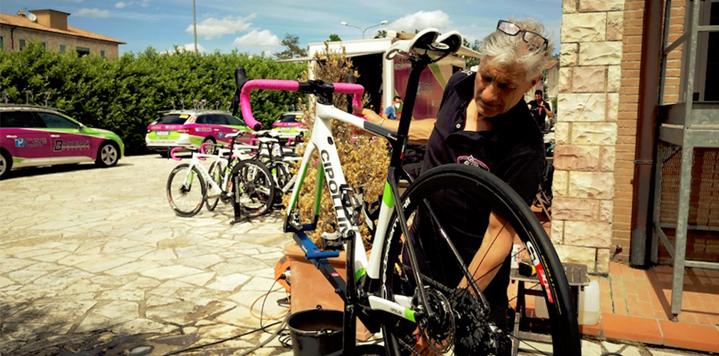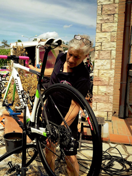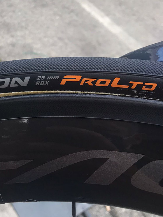 «Noi – ci ha detto Matteo Cornacchione meccanico della Ineos-Grenadiers di Bernal – utilizziamo le ruote Shimano Dura Ace da 40 o da 60 millimetri di profilo a seconda di ciò che vuole il corridore. L’unica cosa che abbiamo cambiato sono state le gomme: usiamo i tubolari Continental Rbx, cioè Roubaix, sempre da 25 millimetri. Semplicemente hanno una sponda e una carcassa più robuste. Li utilizziamo nelle classiche del Nord e abbiamo l’esperienza della Strade Bianche. Per il resto le bici sono totalmente identiche ad una tappa normale».