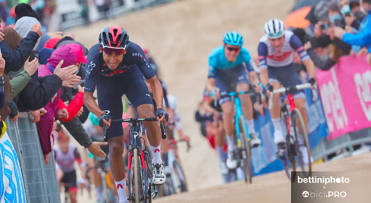 Partiamo dall’inizio: manca un chilometro e mezzo al traguardo, Bernal parte da seduto, poi mette il 53 e si alza sui pedali. E’ il momento dello scatto.