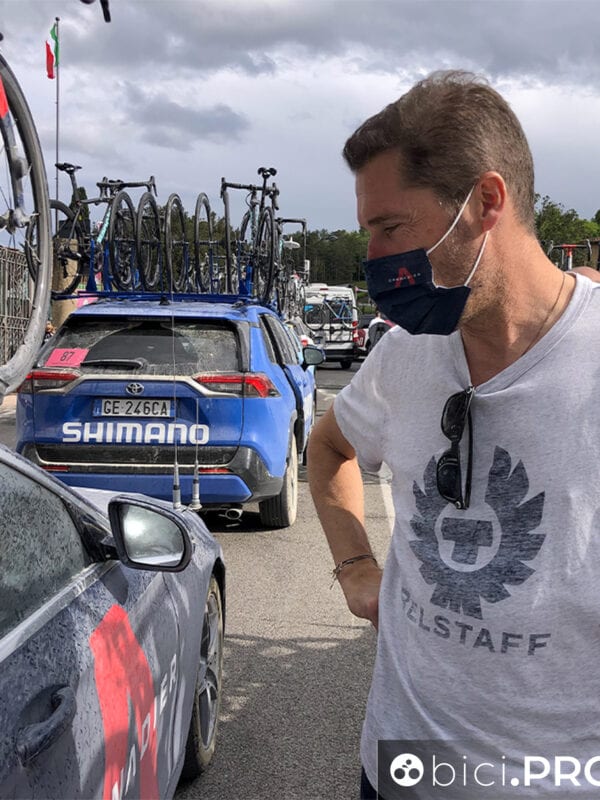 Il tecnico veneto è incolonnato tra le ammiraglie bloccate in un viale parallelo all’arrivo in attesa che passi il gruppetto dei ritardatari e si possa riaprire la strada che porta ai bus.