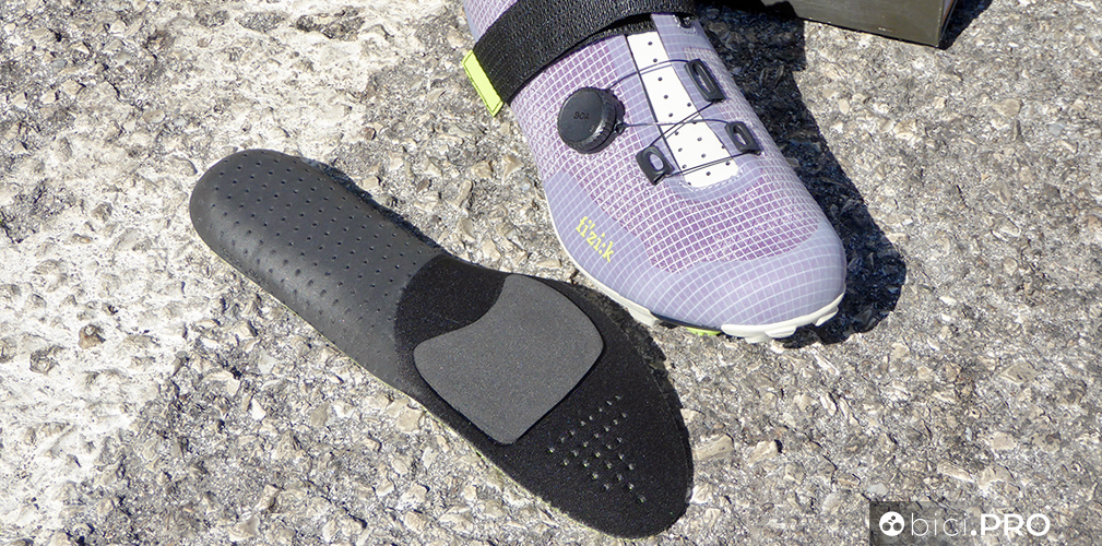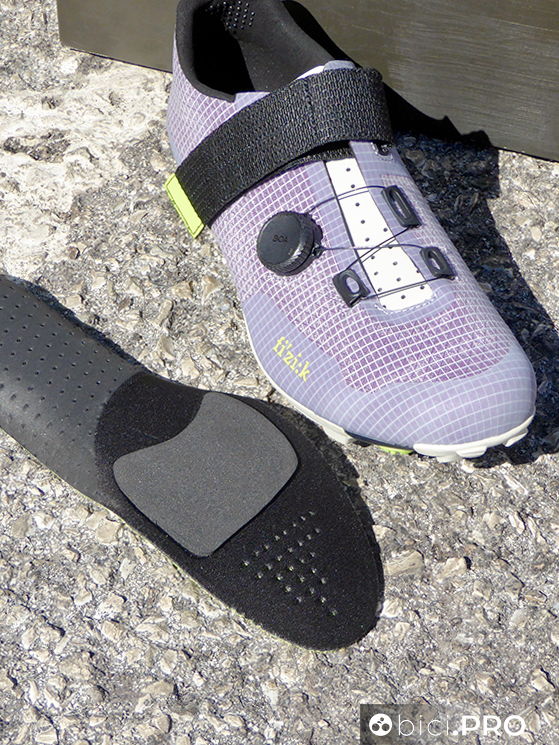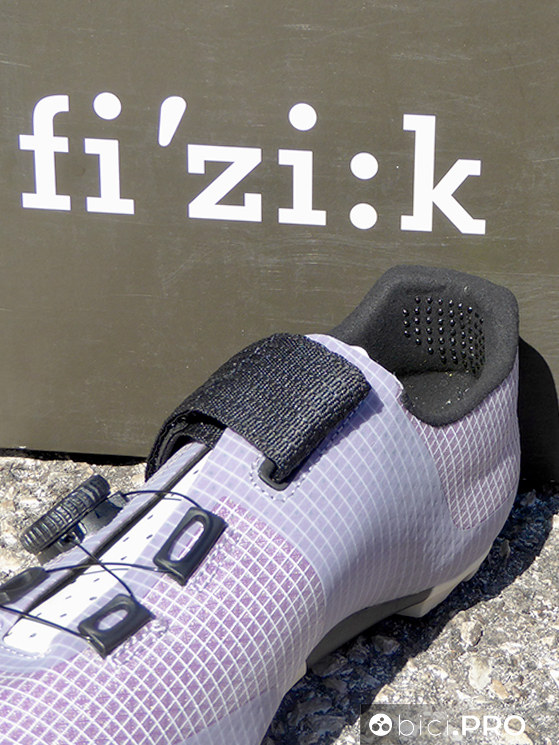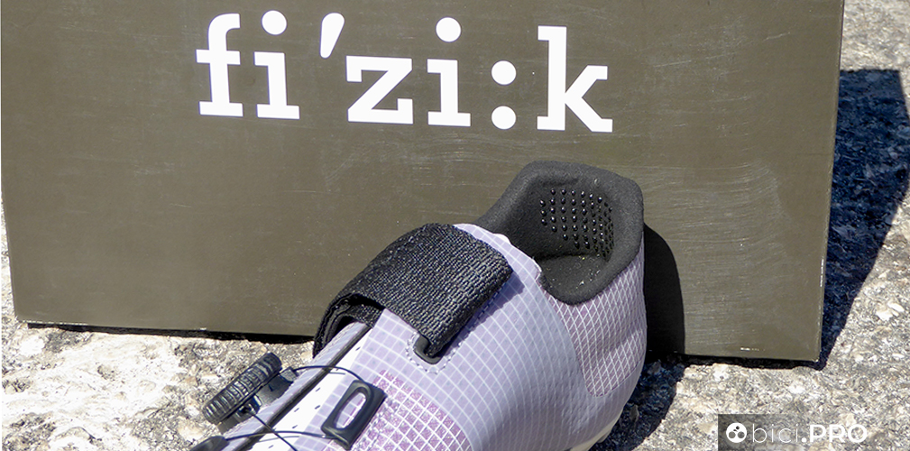 Questa Fizik ha una tomaia sottile e resistente, traspirante e rinforzata nei punti giusti. Adotta una sorta di laminazione e diversi strati, tra il tessuto mesh e gli inserti in PU. Anche la linguetta ha uno spessore contenuto, con tanti fori per la traspirazione. Il supporto al tallone è integrato e nascosto sotto la tomaia.
