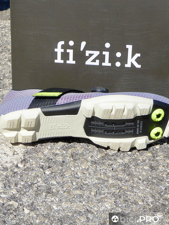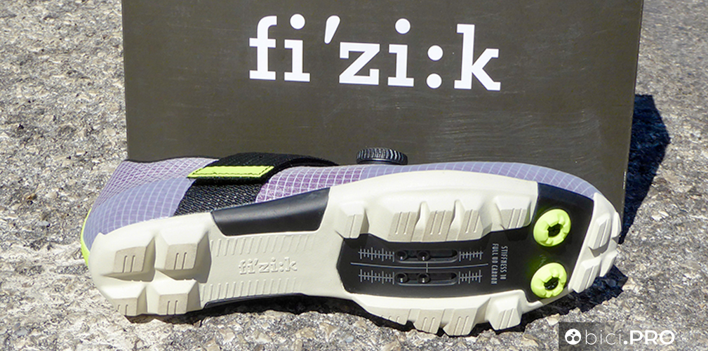 La suola X1 presenta dei ramponi morbidi per aumentare il grip una volta scesi di sella. I tasselli sono abbondantemente spaziati tra loro, per evitare accumuli di detriti e fango. La parte centrale è in carbonio e non presenta lo strato di flatting lucido. La soluzione è voluta e ricercata, perché limita lo scivolamento della tacchetta e mostra una longevità aumentata. E’ compatibile SPD e ha un’indice di rigidità pari a 10 nella scala Fizik.