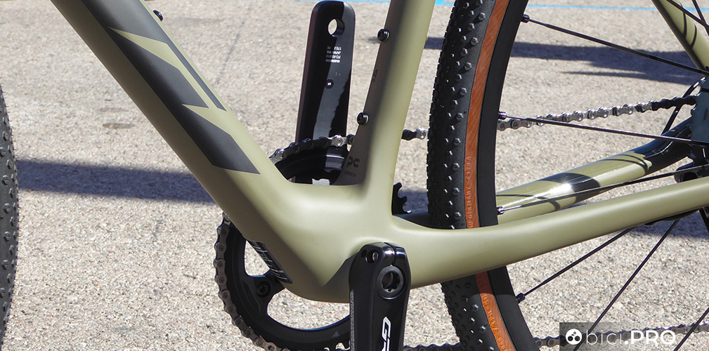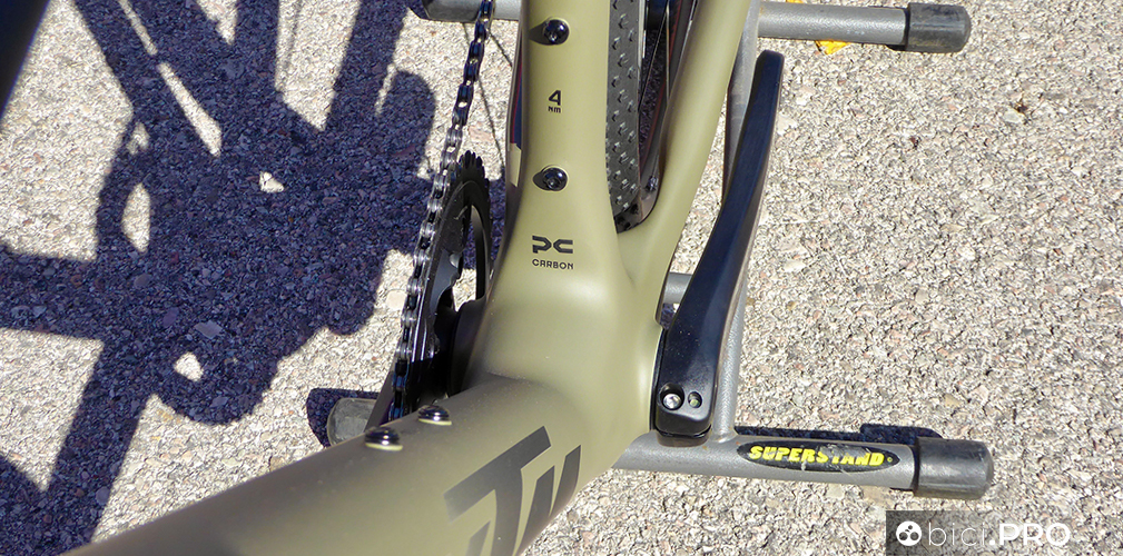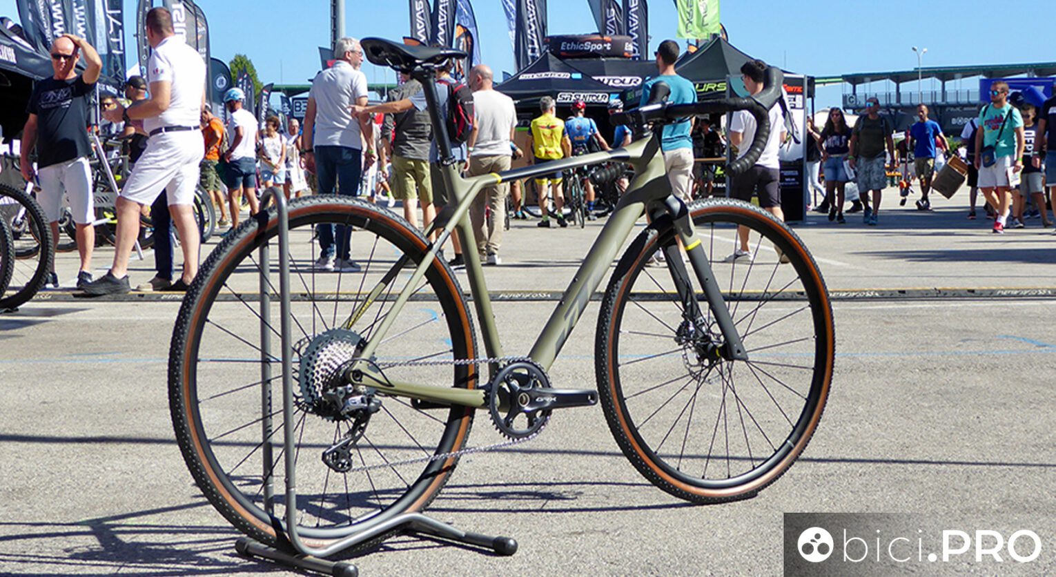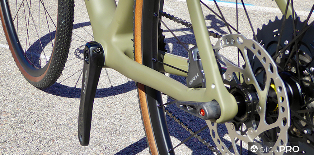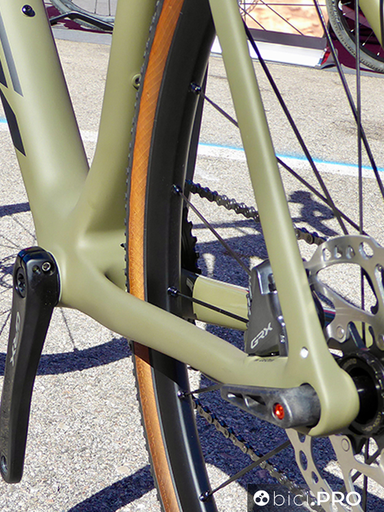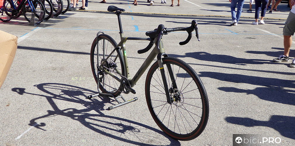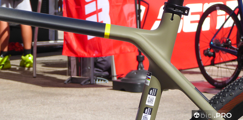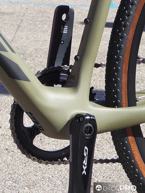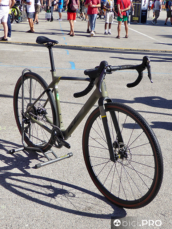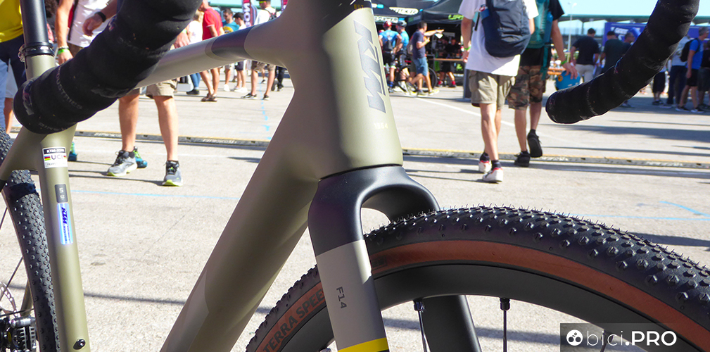 La trasmissione è meccanica, ricordando che c’è una completa compatibilità con i cambi elettromeccanici e si può montare anche il doppio plateau anteriore. La versione fotografata a Misano è aggressiva ed è quella 2023. C’è lo Shimano GRX con mono davanti e 11 rapporti dietro, ma con il bilanciere lungo che permette di montare pignoni normalmente usati nella mtb.