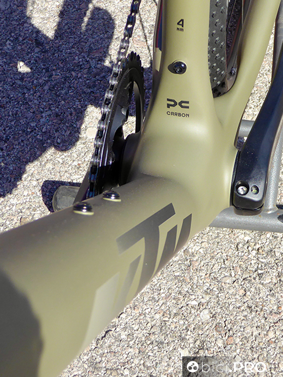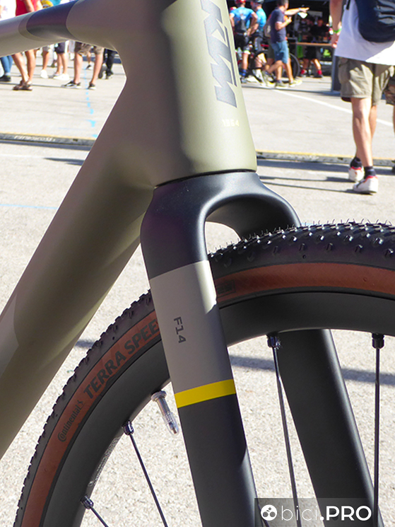 Si parte da un frame-kit con telaio monoscocca in carbonio Premium. La matrice è uguale a quella usata per le bici da strada, ma con delle applicazioni diverse, ovviamente rivolte al segmento gravel. Anche la forcella (F14) è full carbon, ma utilizza il modulo Performance, meno sofisticato rispetto al precedente e parecchio sostanzioso. Al primo impatto sembra una forcella aero e mutua una parte del suo design da quella impiegata sulle road Lisse e Revelator Alto (versione più anziana).