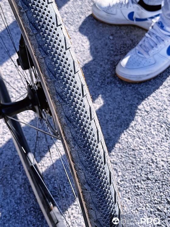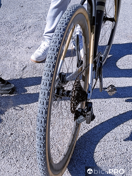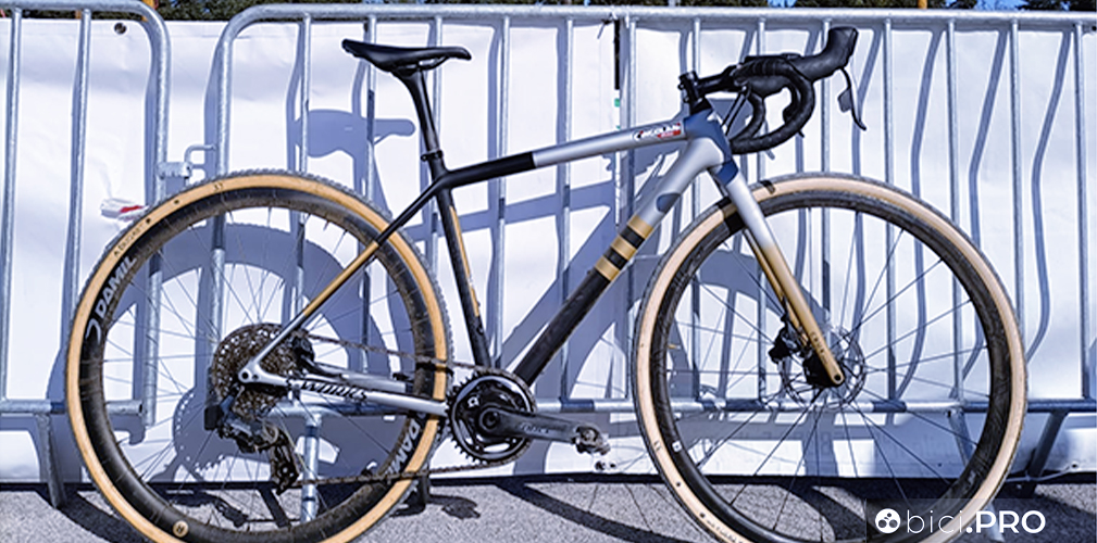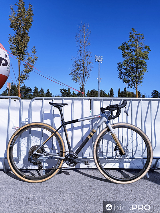 «Le gomme? Stamattina avevamo provato quelle super scorrevoli ma erano troppo scivolose. Alla fine abbiamo scelto questo setup: scorrevole davanti, tassellata da fango dietro. In più avevo la borraccia… che con questo caldo e il body della maglia rosa lungo era d’obbligo».