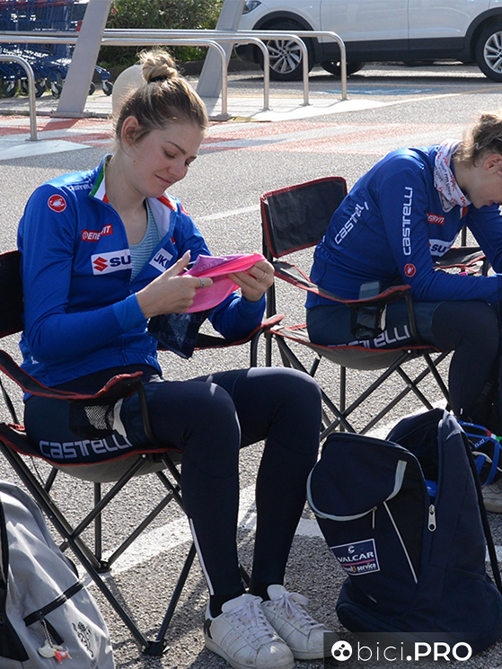 Martina è uno dei pezzi forti del nostro quartetto. Agli europei di Plovdiv ha prima aiutato il quartetto a realizzare il nuovo titolo italiano dell’inseguimento a squadre, mentre l’indomani ha abbassato di 4” quello dell’individuale. Nel ritiro della nazionale sull’Etna, è anche l’addetta alla logistica degli allenamenti. E’ lei a tracciare il percorso coordinandosi con Salvoldi e poi a guidare le ragazze su strada. La sua presenza è discreta e sorniona. Tante volte la vedi seduta a margine del baccano delle altre come se fosse distratta, però segue tutto.