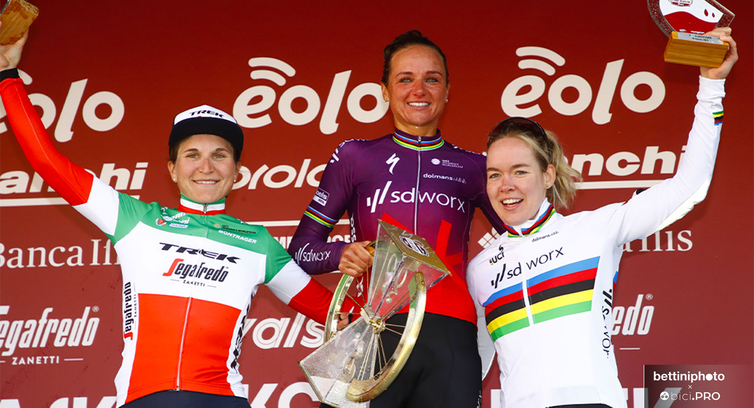 Il solo lato positivo delle mascherine è la possibilità di focalizzare l’attenzione sugli occhi e in questo pomeriggio mite in Toscana, gli occhi di Chantal Van den Broek-Blaak, olandese di 31 anni, impazziscono di gioia. Da italiani, bisognerebbe avercela un po’ con lei, ma quando un’atleta confeziona così bene una vittoria, viene spontaneo batterle le mani.