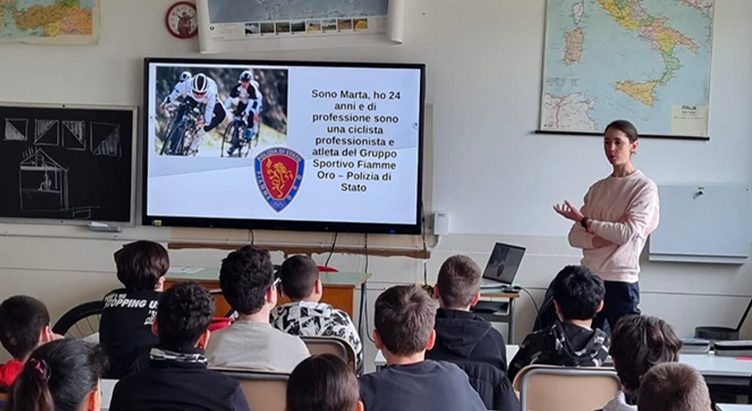 Stamattina Marta Cavalli è entrata nuovamente dal portone nell’Istituto Comprensivo Marco Gerolamo Vida di San Bassano, invitata a parlare della sua vita, del ciclismo, dello sport e di come lo si possa collegare alla scuola. Ha parlato di cultura alimentare e di sicurezza stradale, poi è tornata a casa ed è uscita per allenarsi.
