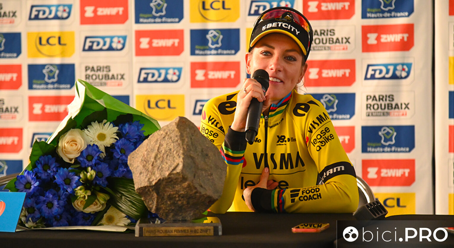 Ci sono ragazze là fuori, affrante e sfinite sui loro pullman, che darebbero una mano per essere qui al suo posto, con il pavé e i fiori del vincitore. Invece lei che la Roubaix l’ha appena vinta al primo assalto ha l’atteggiamento quasi irriverente di chi è abituato a vincere su traguardi più importanti. Le domande si susseguono: dal racconto dell’attacco al dispositivo Gravaa per gonfiare e sgonfiare i tubeless sulla sua Cervélo che a sentirla le hanno salvato la vita.