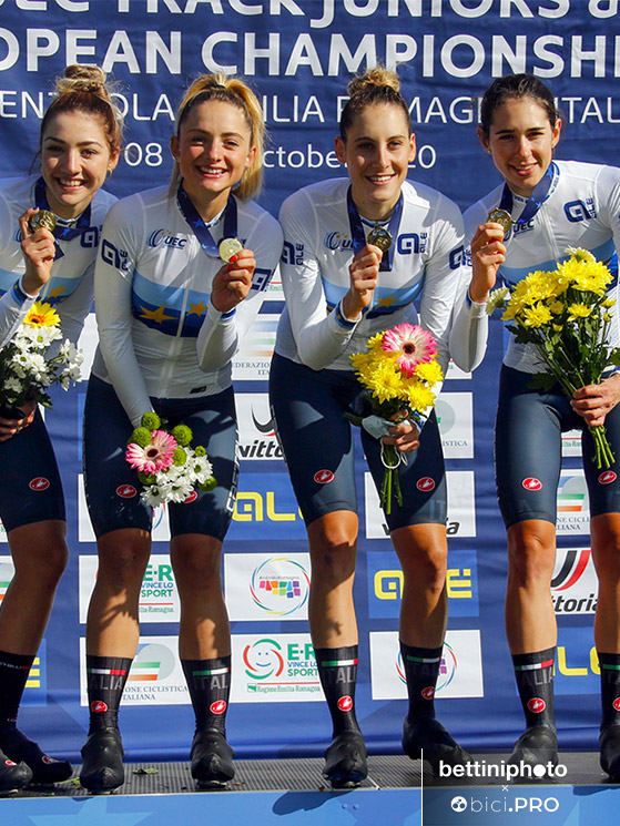 Con Fidanza, Guazzini, Cavalli, campionessa d’Europa U23 del quartetto a Fiorenzuola nel 2020 E poi nella madison con Martina Fidanza