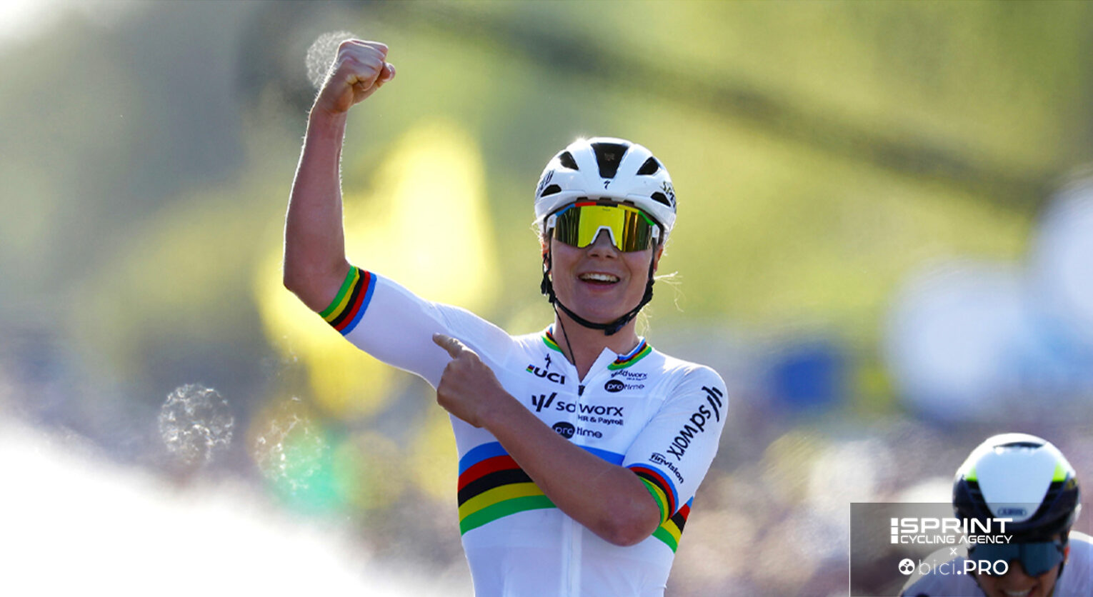 La campionessa del mondo del Team SD Worx-Protime ha regolato allo sprint il gruppetto di quattro con cui è sopravvissuta alla serie dei muri, in una corsa dura che ha visto l’arrivo di sole 87 ragazze. Distanza di 168,9 chilometri con 1.324 metri di dislivello, corsi a 38,304 di media.
