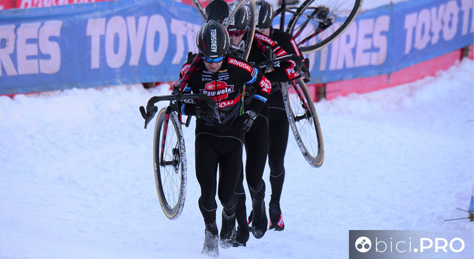 Iserbyt è il solo che è riuscito a farla in sella: eccolo mentre schiva altri atleti Il belga, campione europeo 2020, sembra a suo agio nel nuovo terreno