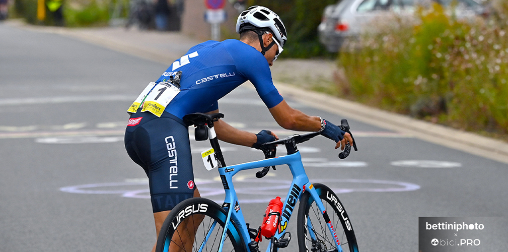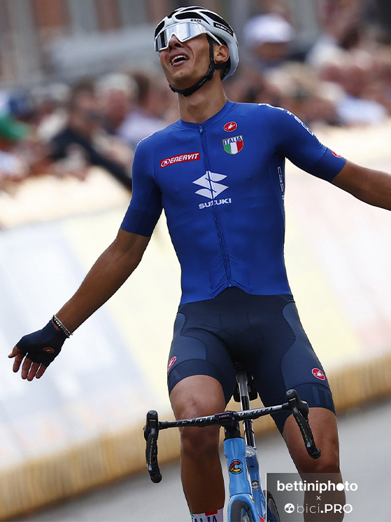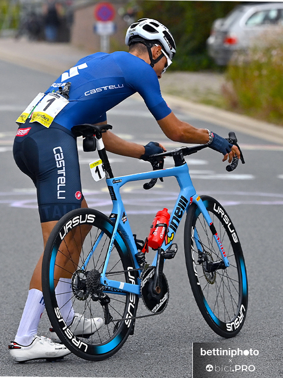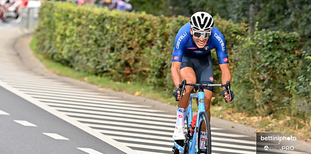 Si vedeva che stava bene. La sua Cinelli scorreva via facile, facile. E quando nella svolta a destra che introduceva nel penultimo strappo le quattro maglie azzurre erano in testa, abbiamo capito che a 100 metri dalla fine del tratto duro avrebbe dato la zampata violenta, di cui ci aveva parlato anche Amadori.