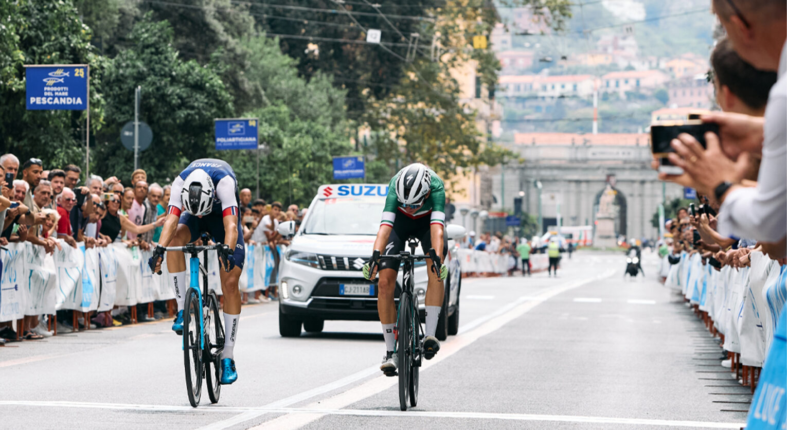LA SPEZIA – La prima tappa del Giro della Lunigiana offre un testa a testa mozzafiato tra Lorenzo Finn e Paul Seixas. Una volata a due su via Domenico Chiodo, nel centro di La Spezia, dove a spuntarla è il francese, che beffa di poco il campione italiano in carica (in apertura foto Duz Image / Michele Bertoloni). Sopra le teste dei corridori risplende un cielo azzurro, mentre sullo sfondo le colline incorniciano un quadro da cartolina. Oltre quei verdi pendii ci sono le Cinque Terre, la testimonianza di come la Liguria sia una regione dove il mare e la montagna vivono in simbiosi.