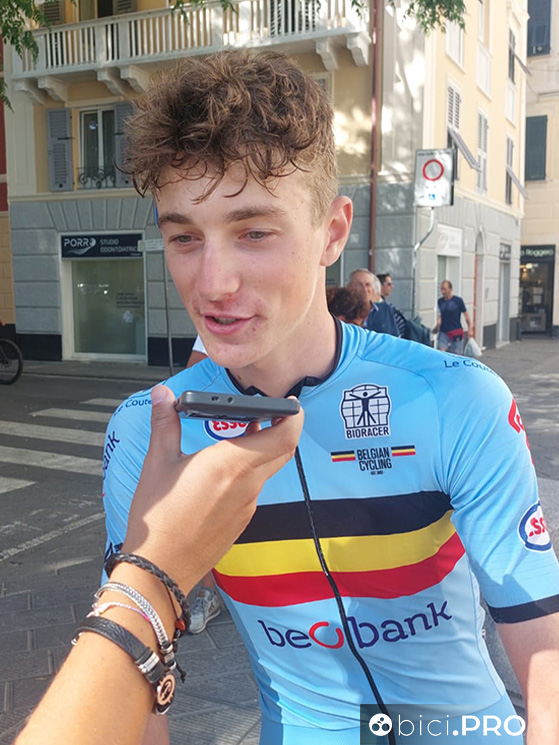 Secondo sul traguardo di Viale Arata a Chiavari è Seff Van Kerckhove, fratello minore di Matisse visto all’opera all’ultimo Giro NextGen con la Visma | Lease a Bike Development e maglia azzurra nelle prime tappe. Seff durante la stagione corre nella Decathlon AG2R La Mondiale U19 ed è un “primo anno” da seguire con attenzione.