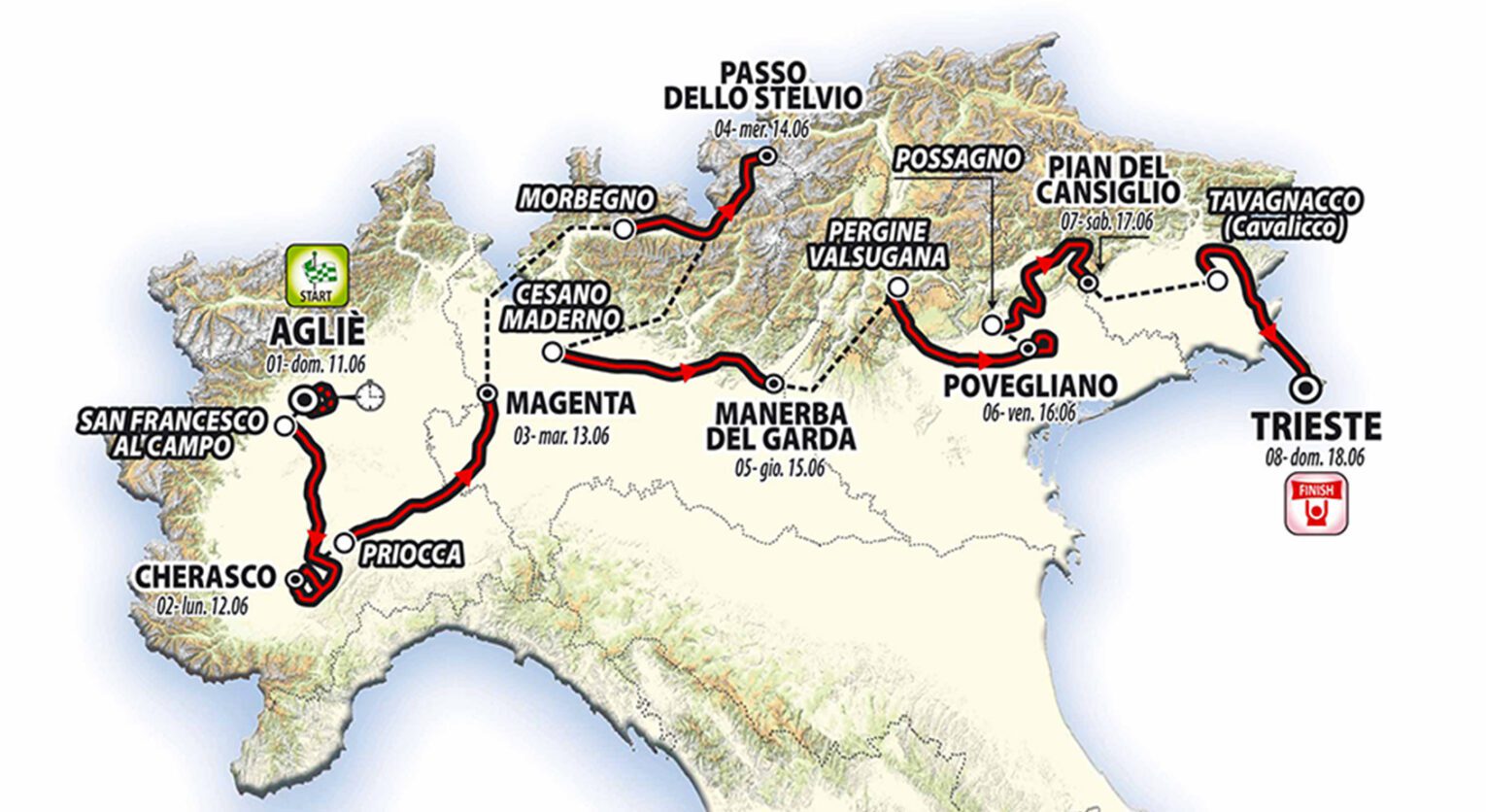 Il percorso è in linea con quanto fatto negli ultimi anni da Extra Giro, con 8 tappe, tutte concentrate in poche regioni: questa volta dal Piemonte al Friuli. Al disegno del percorso si è dedicato il gruppo di lavoro del Giro d’Italia nel tempo libero fra la Sanremo, il Giro di Sicilia e la partenza da Pescara, riuscendo anche ad ottenere lo slittamento di un giorno, in modo da occupare due domeniche anziché una soltanto. Alcuni contatti con Marco Selleri erano stati avviati perché si occupasse di una parte dell’organizzazione, poi tutto si è fermato.