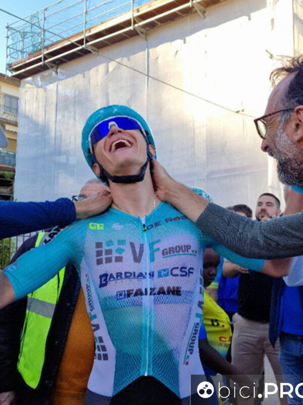 L’ultima curva, ai 300 metri dall’arrivo, ci fa intravedere due maglie, quella della Vf Group-Bardiani CSF-Faizanè di Pinarello e quella di Pescador della GW Shimano. Nell’avvicinarsi allo sprint Pinarello, che parte secondo, prende il riferimento all’avversario e lo brucia. Ha anche il tempo di girarsi ai 25 metri per controllare e poi esplode nella felicità che tanto ha cercato.