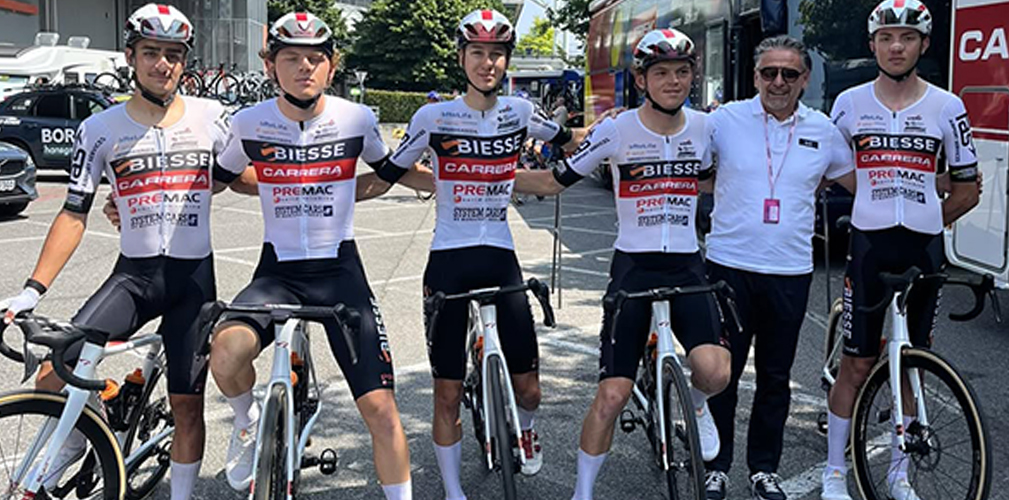 Lucio Dognini, secondo da destra, in una visita alla Biesse-Carrera che sponsorizza