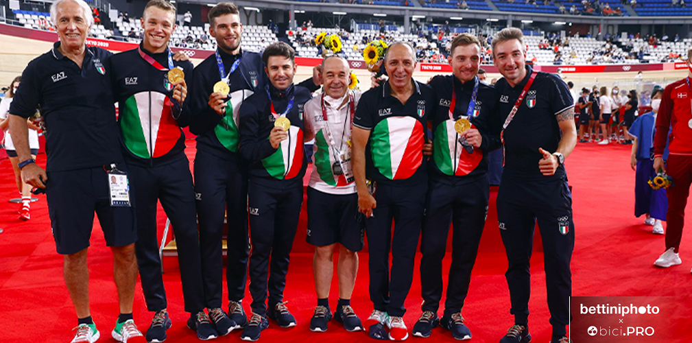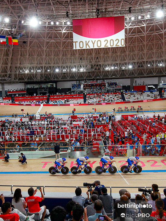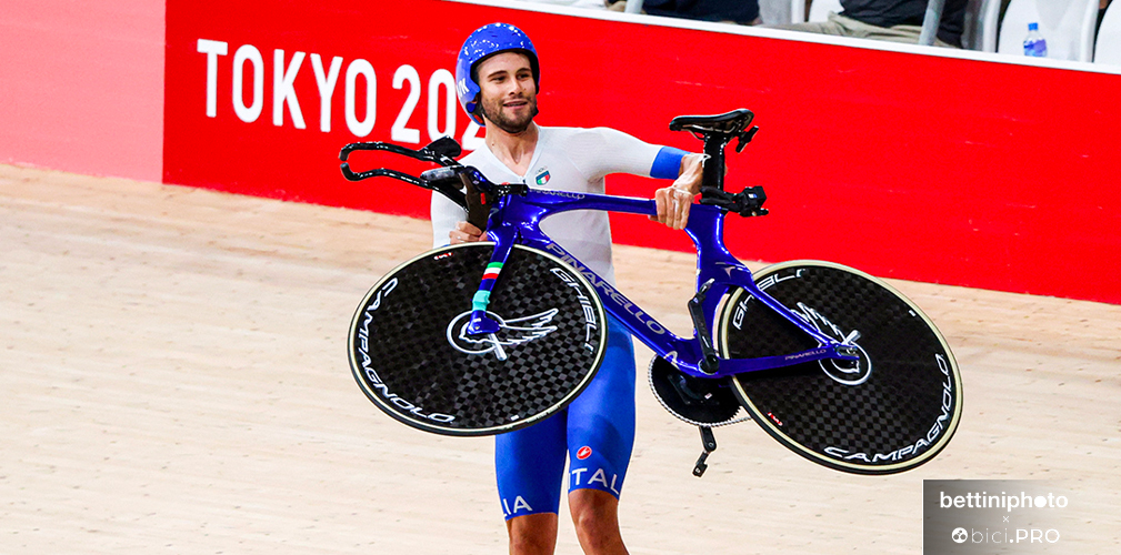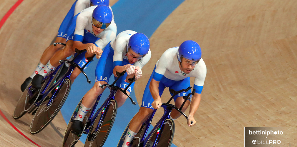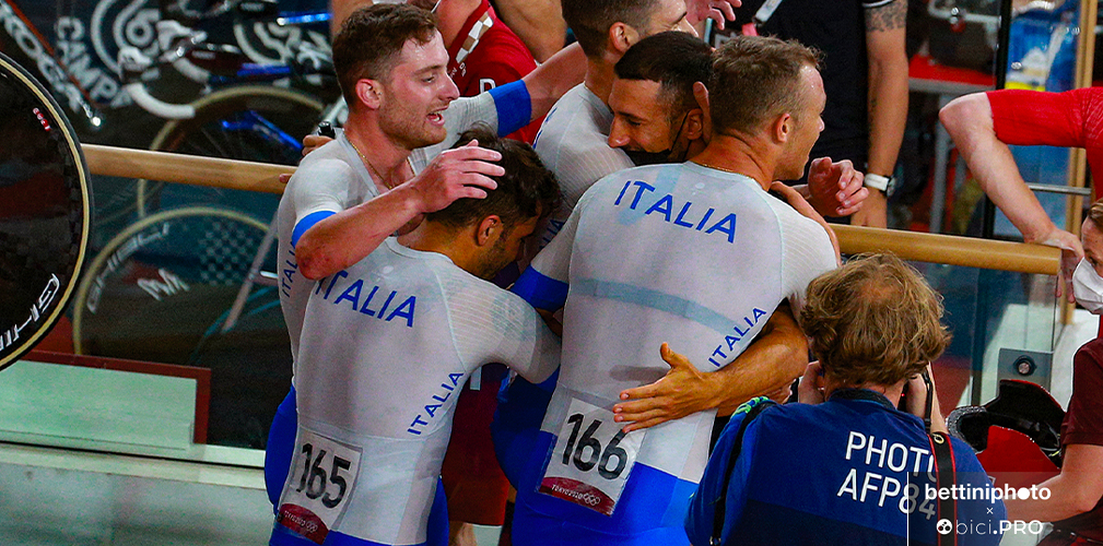 Quattro frecce tricolori hanno tinto d’azzurro il velodromo di Izu. Filippo Ganna, Francesco Lamon, Simone Consonni e Jonathan Milan hanno scritto il loro nome nella leggenda del ciclismo su pista, andando a prendersi a una media impressionante di 64,856 km/h non solo la medaglia d’oro dell’inseguimento a squadre dei Giochi di Tokyo, ma anche il nuovo primato del mondo (3’42”032), che cancella quello di ieri realizzato in semifinale (3’42”307).